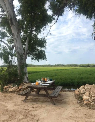 La vivienda se ubica a 180m del río Ebro y a 9 km de su desembocadura. Rodeada de campos de arroz y situada en plena naturaleza, el único ruido que se escucha es el del aire meciendo las hojas.